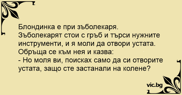 Блондинка е при зъболекаря. Зъболекарят стои с гръб и търси нужните инструменти, и я моли да отвори устата. Обръща се към нея и казва: