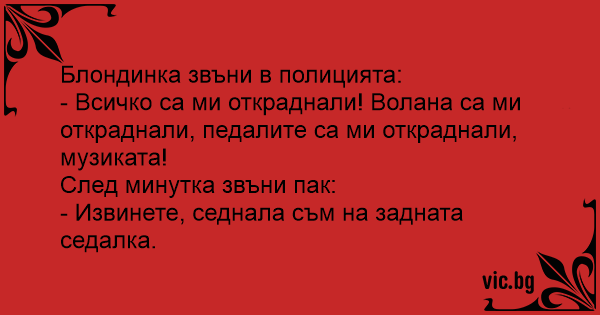 Policijas iecirknī iezvanās telefons. Zvana satraukta blondīne: "Palīdziet es esmu apzagta! Viņi nozaguši no manas mašīnas pilnīgi visu! Pedāļus,stūri, radio..." Pēc brīža blondīne zvana atkal:...