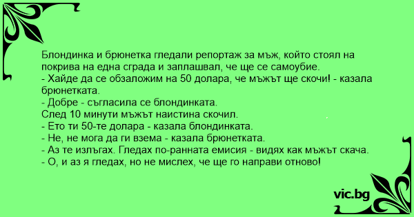 - Хайде да се обзаложим на 50 долара, че мъжът ще скочи! - казала брюнетката.