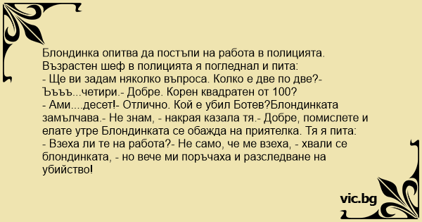 - Ами....десет!- Отлично. Кой е убил Ботев?Блондинката замълчава.- Не знам, - накрая казала тя.- Добре, помислете и елате утре Блондинката се обажда на приятелка. Тя я пита: