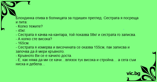 Блондинка отива в болницата за годишен преглед. Сестрата я посреща и пита: