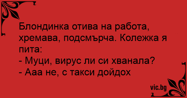 Блондинка отива на работа, хремава, подсмърча. Колежка я пита: