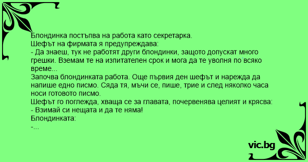 Започва блондинката работа. Още първия ден шефът и нарежда да напише едно писмо. Сяда тя, мъчи се, пише, трие и след няколко часа носи готовото писмо.