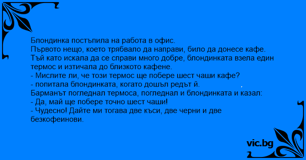 Барманът погледнал термоса, погледнал и блондинката и казал: