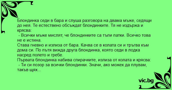Блондинка седи в бара и слуша разговора на двама мъже, седящи до нея. Те естествено обсъждат блондинките. Тя не издържа и крясва: