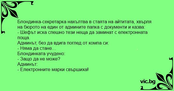 Блондинка-секретарка нахълтва в стаята на айтитата, хвърля на бюрото на един от админите папка с документи и казва: