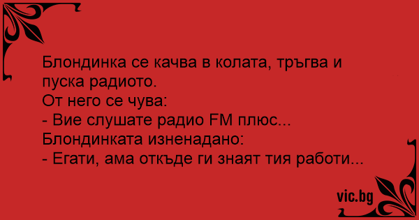 Blondīne brauc automašinā no Venstpils uz Rīgu un, lai nebūtu garlaicīgi, ieslēdz radio! Radio saka: - Jūs klausāties "European Hit Radio"! Blondīne sašutumā kliedz: - Kā viņš to zin?