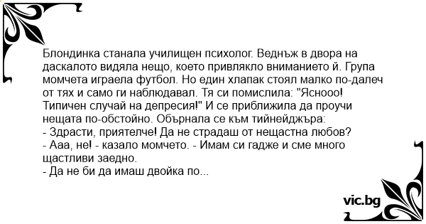 Блондинка станала училищен психолог. Веднъж в двора на даскалото видяла нещо, което привлякло вниманието й. Група момчета играела футбол. Но един хлапак стоял малко по-далеч от тях и само ги наблюдавал. Тя си помислила: "Яснооо! Типичен случай на депресия!" И се приближила да проучи нещата по-обстойно. Обърнала се към тийнейджъра: