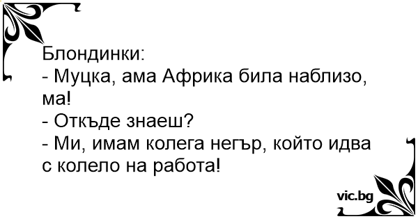 Apu, egyest kaptam az iskolában, mert nem tudtam, hol van Afrika. Te tudod? - Én sem tudom kisfiam, menj, kérdezd meg anyádat! - Anyu, hol van Afrika? - Nem tudom, de nem lehet túl messze! Dolgozik...