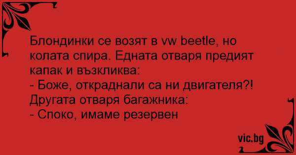 Dwie blondynki podchodzą do malucha. Jedna zagląda pod maskę i krzyczy: - Kurczę, ukradli nam silnik! A druga patrzy do bagażnika i odpowiada: - Spokojnie, mamy zapasowy.