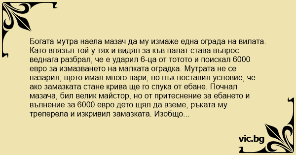Като влязъл той у тях и видял за къв палат става въпрос веднага разбрал, че е ударил 6-ца от тотото и поискал 6000 евро за измазването на малката оградка. Мутрата не се пазарил, щото имал много пари, но пък поставил условие, че ако замазката стане крива ще го спука от eбaнe. Почнал мазача, бил велик майстор, но от притеснение за ебането и вълнение за 6000 евро дето щял да вземе, ръката му треперела и изкривил замазката. Изобщо мутрата не се пазарила дал му парите и викнал двама от охраната си:
