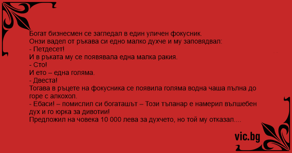 - Eбacи! – помислил си богаташът – Този тъпанар е намерил вълшебен дух и го юрка за дивотии!