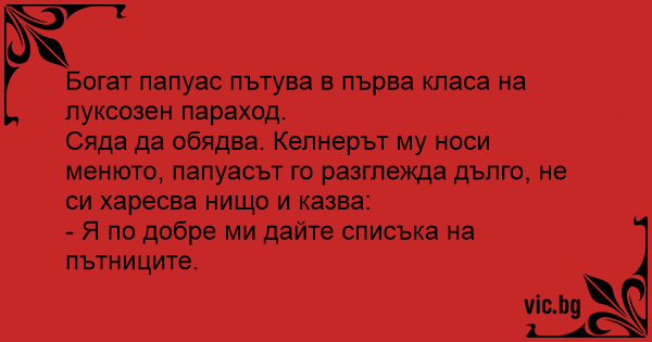 Der Kannibalenhäuptling ist Ehrengast auf dem Traumschiff. Als man ihm die Speisekarte reicht, schüttelt er nur den Kopf: "Bringen sie mir die Passagierliste" Un grand chef cannibale prend pour la première fois l’avion. À midi, l’hôtesse demande ce qu’il veut manger. Il répond : - Eh bien, s’il vous plaît, Mademoiselle, montrez-moi la liste des passagers… In un aereo un cannibale guarda il menu ma non trova nulla che gli piaccia. Chiama allora la hostess e le dice: “Signorina, posso avere la lista dei passeggeri?”. Kannibalen sidder i flyet, og stewardessen spørger: - Ønsker herren at se spisekortet? - Nej tak, giv mig hellere passagerlisten! Kannibalen var på flytur. Etter en stund kom flyvertinnen bort til ham og spurte: – Har De lyst til å se menyen? Da svarte kannibalen: – Nei takk, men jeg vil gjerne se passasjerlisten. Un caníbal va en un avión, y le pregunta la azafata: - ¿Le traigo el menú? - No, mejor tráigame la lista de los pasajeros. Va un canibal en un avión y la azafata le pregunta: ¿Quiere que le traiga el menú? A lo que el canibal responde: No mejor traigame la lista de pasajeros. ¿Y como llama un canibal a un directorio... Was sagt der Kannibale zum Kellner, wenn er auf einer Kreuzfahrt im Schiffsrestaurant etwa essen möchte? Bringen Sie mir die Passagierliste O canibal entra no gigantesco restaurante do transatlântico de luxo. Um garçom vem atendê-lo: — Gostaria de ver o menu, senhor? — Não. Pode trazer a lista de passageiros mesmo... Resulta que un caníbal viajaba en un avión, y a la hora de almorzar, se le acerca la azafata y le pregunta: ¿Le traigo la carta del menú? No, mejor tráigame la lista de pasajeros. Este es un caníbal que va en avión, y a la hora de comer, pasa una azafata y le pregunta: ¿Quiere que le traiga el menú? Y el caníbal responde: No, mejor tráigame la lista de pasajeros. Ein Kannibale fliegt zum ersten mal. Die Stewardes kommt vorbei und fragt: Στο πλοίο Ein Kannibale im Flugzeug What does a cannibal say to the waiter in a restaurant on a cruise ship? “Please bring me the passenger list.” Um canibal vai viajar de avião, e ao receber o menu do jantar diz a aeromoça: — Prefiro a lista de passageiros. Un cannibalale prend l'avion pour la première fois. Pour le déjeuner l'hôtesse lui demande ce qu'il veut manger. - Pourriez-vous m'apporter la liste des passager, s'il vous plaît? Viaja un canibal en un avión,y le dice la azafata: - Ahora le traigo el menú. Y dice el canibal: - No,prefiero que me traiga la lista de pasajeros. Un canibal calatoreste Cu avionul. Stewardesa il intreaba: - Cu ce va pot servi? - Pai,aduceti-mi mai intai lista pasagerilor. Un canibal călătorea cu avionul. Stewardesa îl întreabă: - Ce aţi dori să serviţi de mîncare? La care canibalul: - Îmi aduceţi, vă rog, lista pasagerilor... Insotzitoarea de zbor il intreaba pe un canibal daca doreshte sa consulte meniul. Canibalul cere lista pasagerilor....
