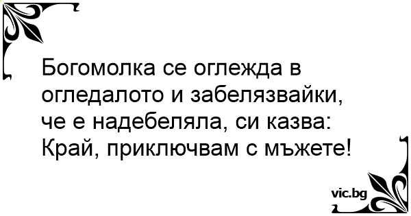 Богомолка се оглежда в огледалото и забелязвайки, че е надебеляла, си казва: