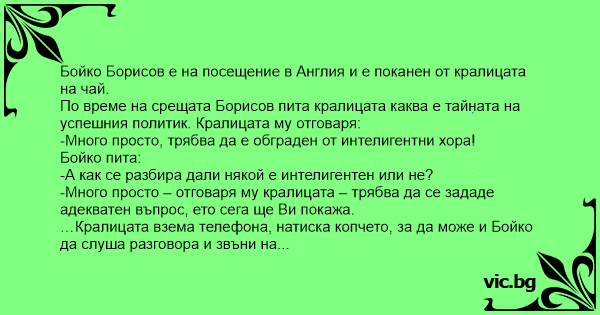 -Правилно, благодаря Ви – казва кралицата, затваря телефона и се обръща към Бойко: