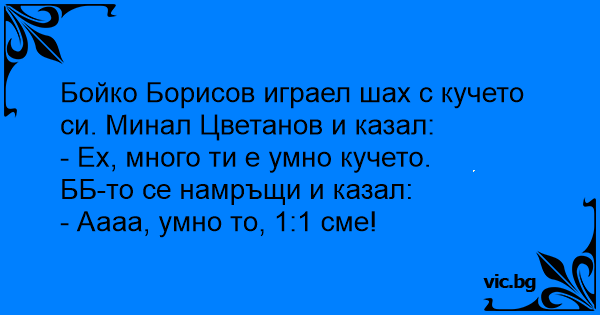 Pe terasa unei cafenele, se petrece de cîtăva vreme o scenă ciudată: un om şi un cîine stau faţă în faţă, avînd între ei o tablă de şah. Mirat, un tip întreabă: - Cum, cîinele dv. ştie cu adevărat...
