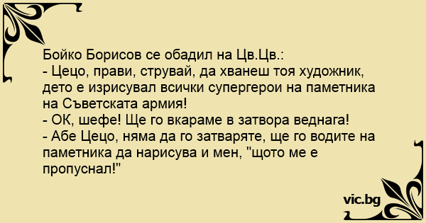 - Цецо, прави, струвай, да хванеш тоя художник, дето е изрисувал всички супергерои на паметника на Съветската армия!