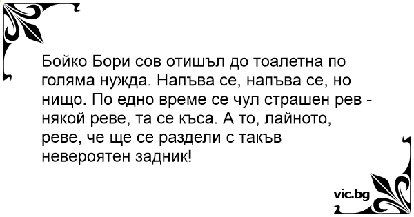 Бойко Бори сов отишъл до тоалетна по голяма нужда. Напъва се, напъва се, но нищо. По едно време се чул страшен рев - някой реве, та се къса. А то, лайното, реве, че ще се раздели с такъв невероятен зaдниk!