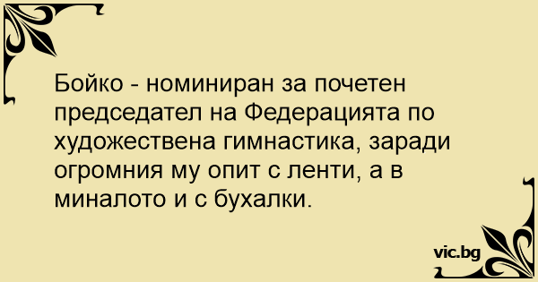 Бойко - номиниран за почетен председател на Федерацията по художествена гимнастика, заради огромния му опит с ленти, а в миналото и с бухалки.
