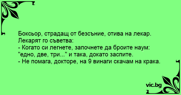 Боксер, страдающий бессоницей на приеме у врача. Боксьор, страдащ от безсъние е при дотора да му помогне. Un boxeador padece de insomnio y se lo dice a un amigo. - Oye, ¿y has probado a contar hasta quedarte dormido?. - Si, pero es que al llegar a 9 me levanto de la lona.