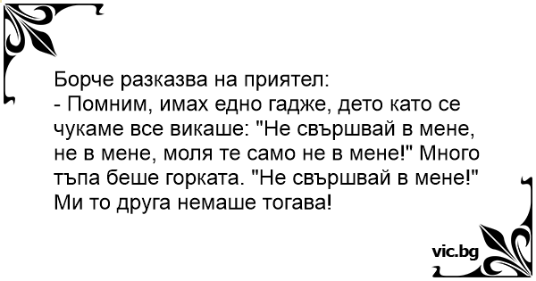 - Помним, имах едно гадже, дето като се чукаме все викаше: "Не свършвай в мене, не в мене, моля те само не в мене!" Много тъпа беше горката. "Не свършвай в мене!" Ми то друга немаше тогава!