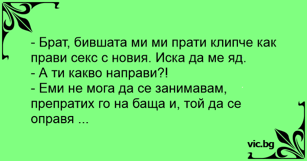 - Брат, бившата ми ми прати клипче как прави cekc с новия. Иска да ме яд.