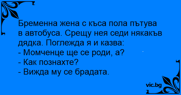 Бременна жена с къса пола пътува в автобуса. Срещу нея седи някакъв дядка. Поглежда я и казва: