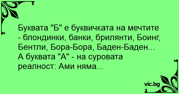 Буквата "Б" е буквичката на мечтите - блондинки, банки, брилянти, Боинг, Бентли, Бора-Бора, Баден-Баден...