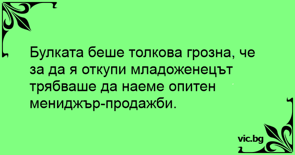 Булката беше толкова грозна, че за да я откупи младоженецът трябваше да наеме опитен мениджър-продажби.