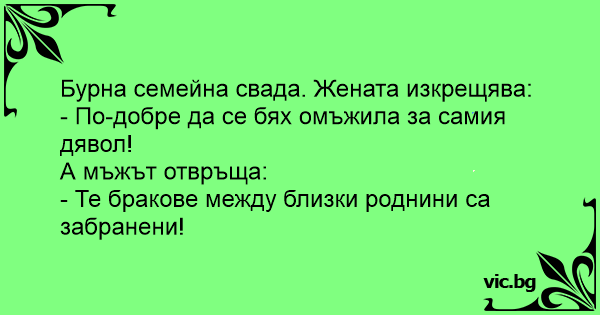 En man och hans hustru grälade. Hustrun: - Jag kunde lika gärna ha gift mig med fan själv! Mannen: - Så nära släktingar får inte gifta sig!