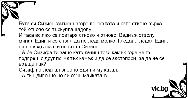 - А бе Сизифе ти защо като качиш този камък горе не го подпреш с друг по-малък камък и да се застопори, за да не се връща пак?