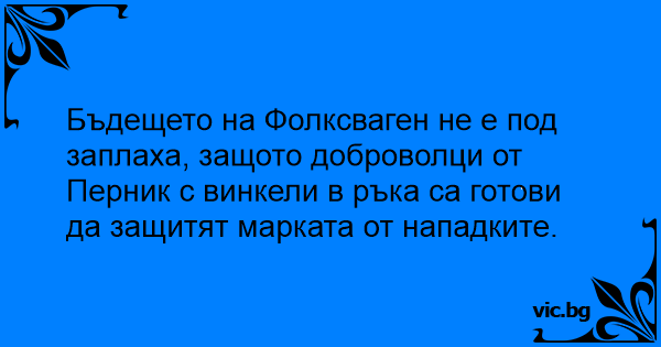 Бъдещето на Фолксваген не е под заплаха, защото доброволци от Перник с винкели в ръка са готови да защитят марката от нападките.