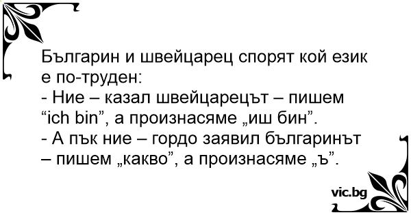 - А пък ние – гордо заявил българинът – пишем „какво”, а произнасяме „ъ”.