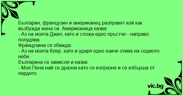 Българин, французин и американец разправят кой как възбужда жена си. Американеца казва: