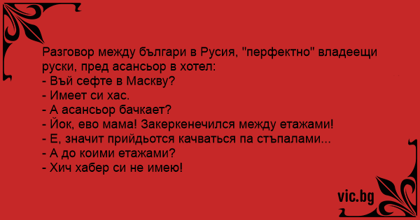 Разговор между българи в Русия, "перфектно" владеещи руски, пред асансьор в хотел:
