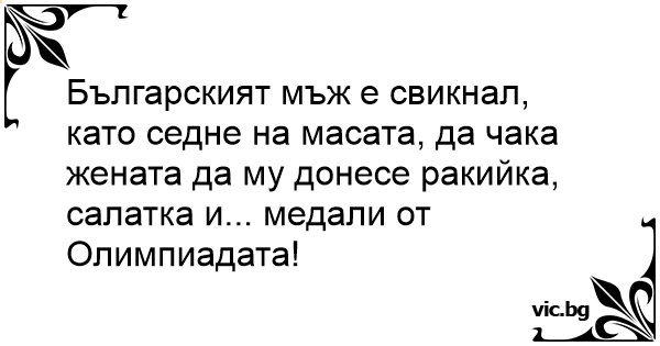 Българският мъж е свикнал, като седне на масата, да чака жената да му донесе ракийка, салатка и... медали от Олимпиадата!