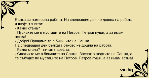 Бълха си намерила работа. На следващия ден не дошла на работа и шефът я пита: