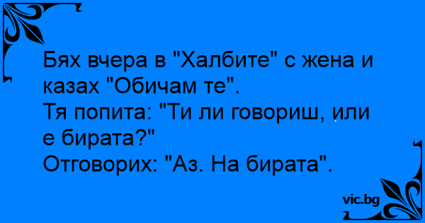 Ο σύζυγος αράζει στη βεράντα μαζί με τη γυναίκα του πίνοντας μπύρα. Αφού έχει πιει αρκετές, σπάει την ησυχία λέγοντας: Boy: "I love you so much, I could never live without you." Седят си мъж и жена му на верандата и се наслаждават на прекрасен залез... Мъжът тихо прошепва: - Обичам те.... Жена му саркастично го пита... - Ти ли говориш или бирата..? Мъжа отговаря.. - Аз говоря ... на бирата..... Мъжът: "Обичам те! " Жената: " Ти ли го казваш или бирата? " Мъжът: " Аз го казвам на бирата." Once upon a time, my wife and I were in the local restaurant. We have talked to each other, but after a while, I have become quiet and then I started to talk, I have said: "you know, I love you so much, I will never leave you, never, ever, every single day I think only of you, we will be always... Following conversation took place between husband and wife in a cafe. Husband: I love you. Wife: Is that you talking or the wine? Husband: I was talking to the wine.