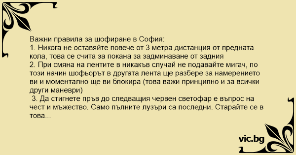 11. Ако карате в лявата лента на Цариградско и някой хитрец-идеалист не ви пуска докато карате със 120-140, моментално изпреварете отдясно (ако се наложи и през бус лентата) и набийте спирачки пред тарикатчето. Може да го паркирате с 40км/ч до Орлов мост, като толкова му се спазва правилника