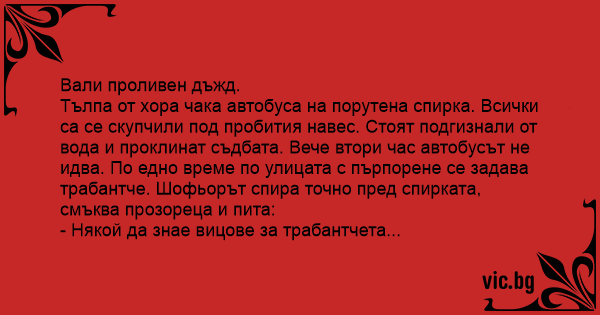 Тълпа от хора чака автобуса на порутена спирка. Всички са се скупчили под пробития навес. Стоят подгизнали от вода и проклинат съдбата. Вече втори час автобусът не идва. По едно време по улицата с пърпорене се задава трабантче. Шофьорът спира точно пред спирката, смъква прозореца и пита: