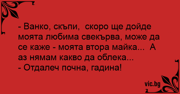 - Ванко, скъпи, скоро ще дойде моята любима свекърва, може да се каже - моята втора майка... А аз нямам какво да облека...