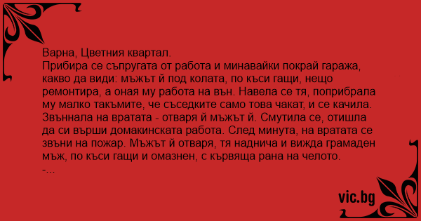 Прибира се съпругата от работа и минавайки покрай гаража, какво да види: мъжът й под колата, по къси гащи, нещо ремонтира, а оная му работа на вън. Навела се тя, поприбрала му малко такъмите, че съседките само това чакат, и се качила. Звъннала на вратата - отваря й мъжът й. Смутила се, отишла да си върши домакинската работа. След минута, на вратата се звъни на пожар. Мъжът й отваря, тя наднича и вижда грамаден мъж, по къси гащи и омазнен, с кървяща рана на челото.