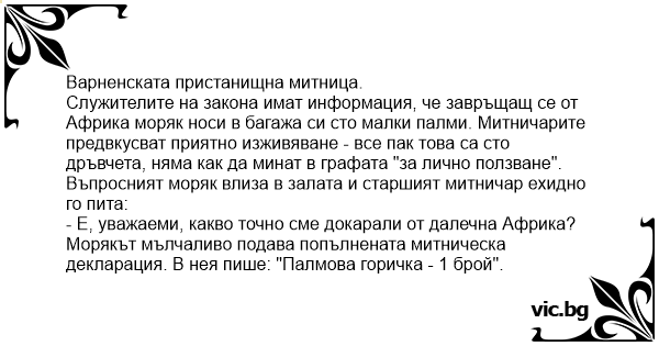 Служителите на закона имат информация, че завръщащ се от Африка моряк носи в багажа си сто малки палми. Митничарите предвкусват приятно изживяване - все пак това са сто дръвчета, няма как да минат в графата "за лично ползване". Въпросният моряк влиза в залата и старшият митничар ехидно го пита: