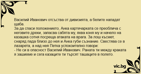 - Не си в опасност Василий Иванович. Раната ти между краката я зашихме и сега казаците ти търсят taшaциte в полето.