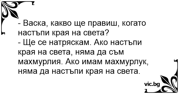 - Ще се натряскам. Ако настъпи края на света, няма да съм махмурлия. Ако имам махмурлук, няма да настъпи края на света.