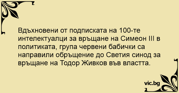 Вдъхновени от подписката на 100-те интелектуалци за връщане на Симеон III в политиката, група червени бабички са направили обръщение до Светия синод за връщане на Тодор Живков във властта.