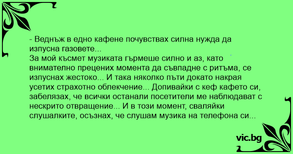 За мой късмет музиката гърмеше силно и аз, като внимателно прецених момента да съвпадне с ритъма, се изпуснах жестоко... И така няколко пъти докато накрая усетих страхотно облекчение... Допивайки с кеф кафето си, забелязах, че всички останали посетители ме наблюдават с нескрито отвращение... И в този момент, сваляйки слушалките, осъзнах, че слушам музика на телефона си...