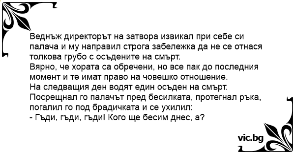 На следващия ден водят един осъден на смърт. Посрещнал го палачът пред бесилката, протегнал ръка, погалил го под брадичката и се ухилил: