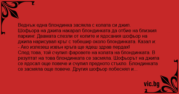 След това, той счупил фаровете на колата на блондинката. В резултат на това блондинката се засмяла. Шофьорът на джипа се ядосал още повече и счупил предното стъкло. Блондинката се засмяла още повече. Другия шофьор побеснял и нарязал гумите. Блондинката почнала да се търкаля от смях. Не издържал другия шофьор и попитал: