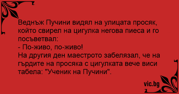 На другия ден маестрото забелязал, че на гърдите на просяка с цигулката вече виси табела: "Ученик на Пучини".